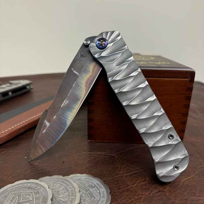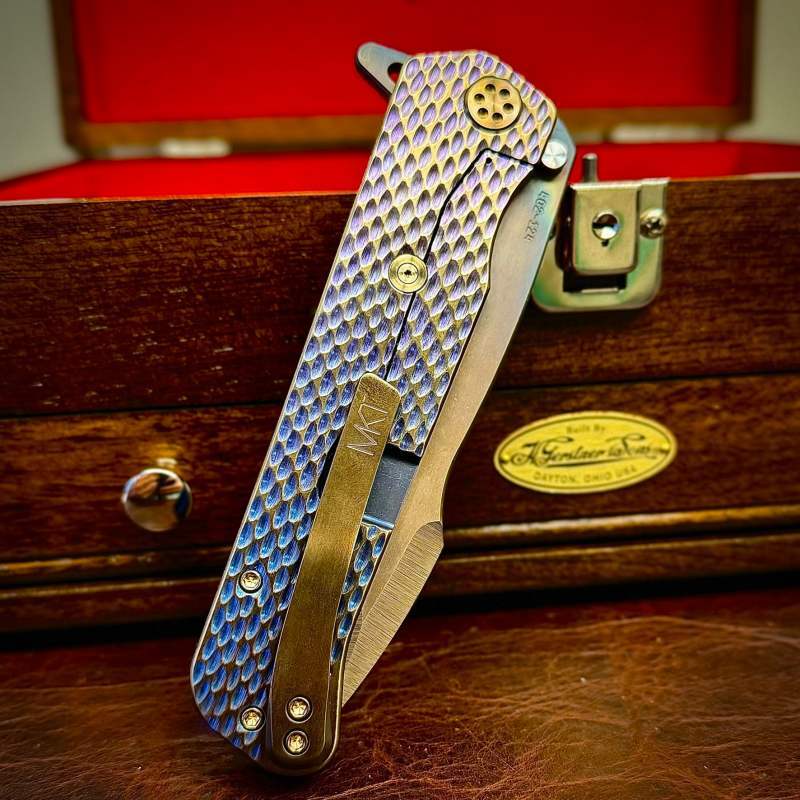 The model was introduced around 2015-2016 and had an immediate splashdown as one of the most ergonomic and satisfying flippers in the Medford Knife & Tool lineup. The action of the knife was phenomenal despite its size and its profile didn’t cut or tear the pocket. Flexing a 6″ closed length and $800 base price, it did command and attract the deepest of pockets. After all, the Titans from Greek mythology would carry this knife. It is HUGE. The knife sports a “Harpoon” style floated false edge and extremely practical main edge for all seasons. For men with big hands, this knife was right at home. For normal hands this knife was stunning in its light weight and very comfortable feel. It was truly a pocket SWORD.