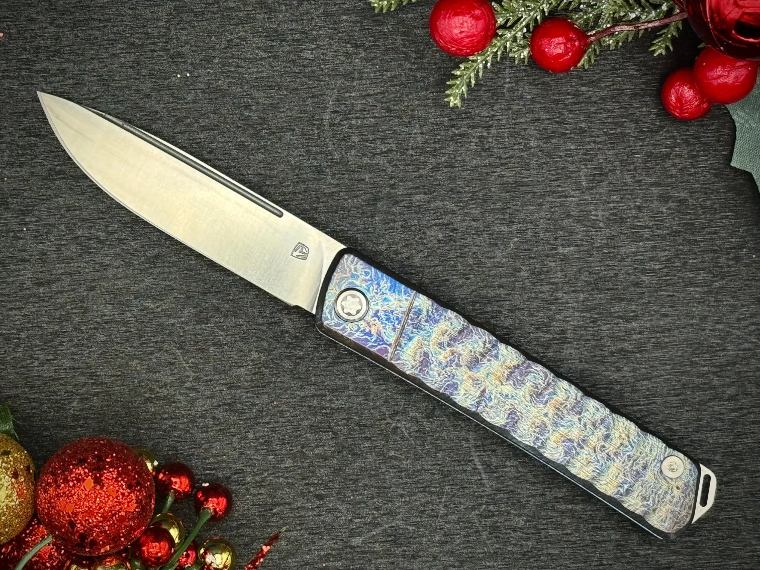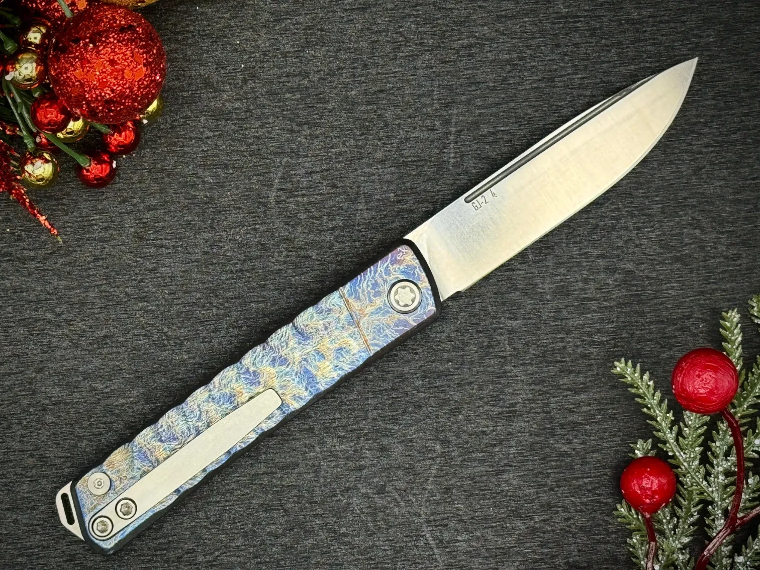 S45VN TUMBLED DROP POINT BLADE, ACID ETCH ‘LIGHTNING’ SCULPTED HANDLES STANDARD HARDWARE & CLIP