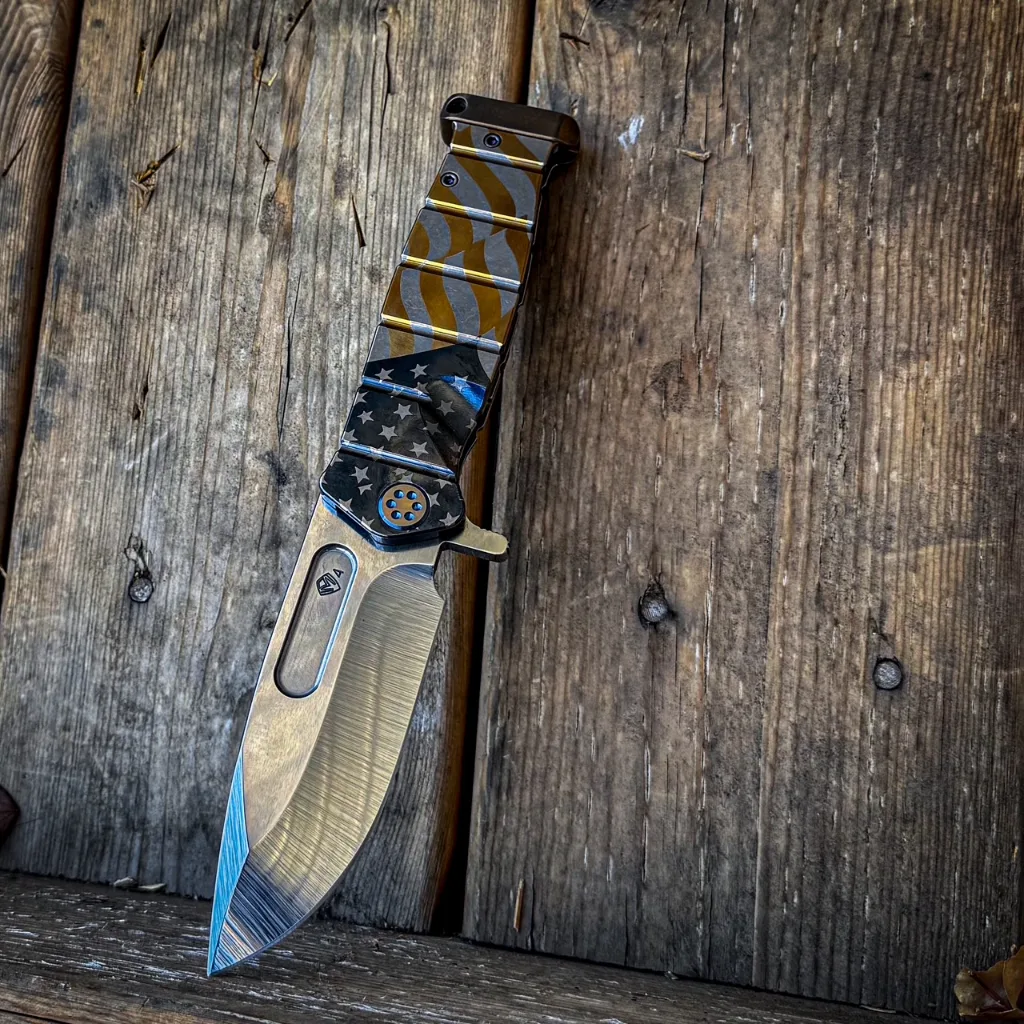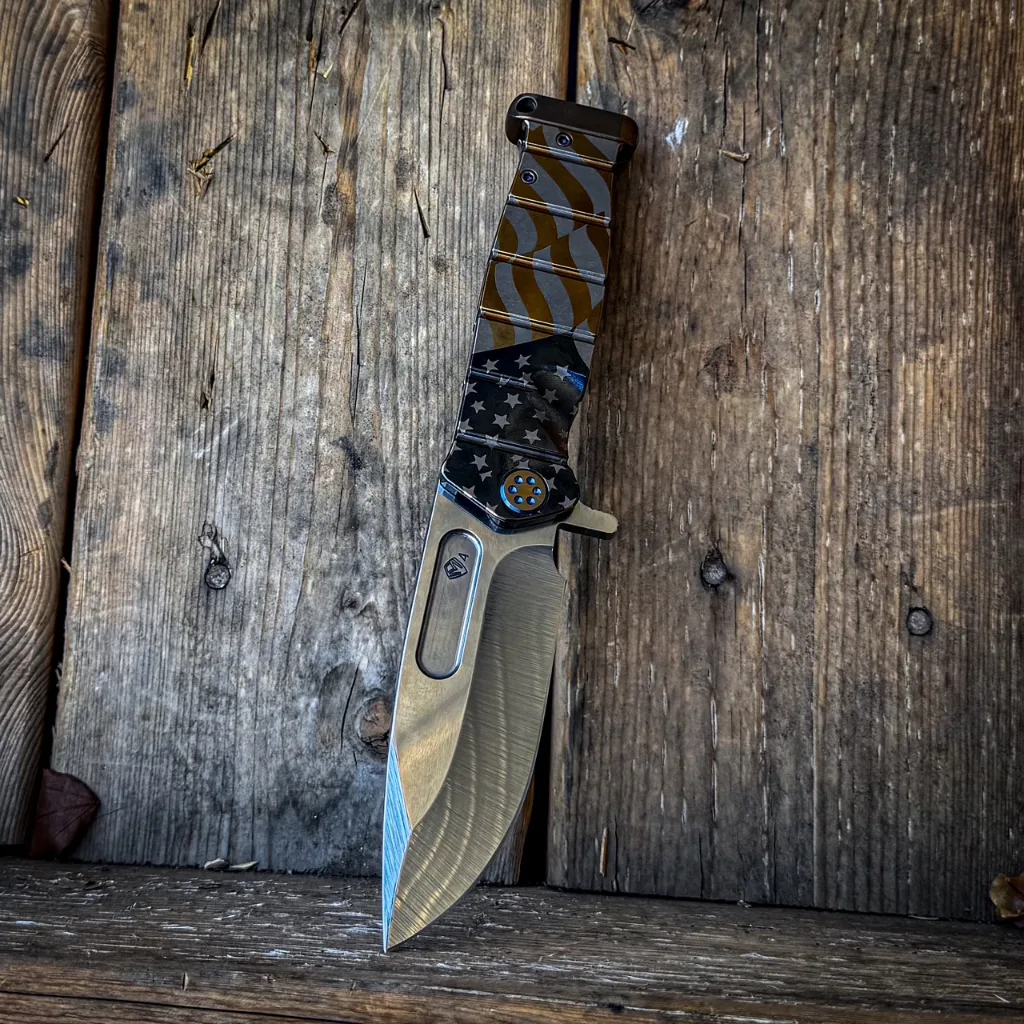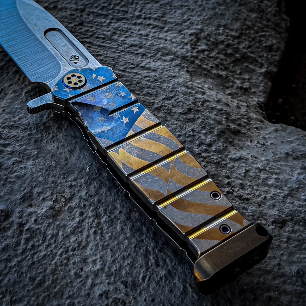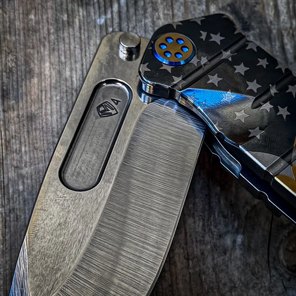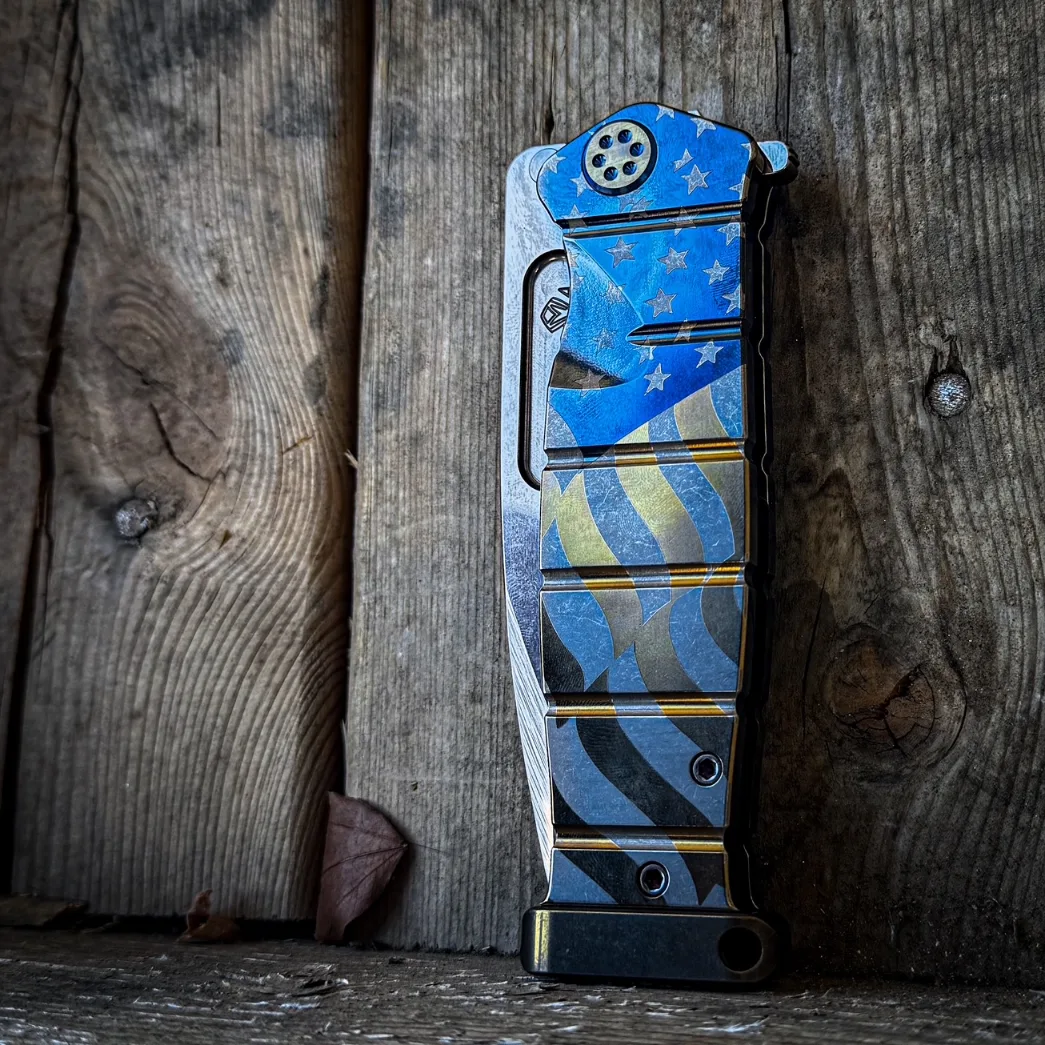 CPM S35/45VN TUMBLED BLADE AMERICAN FLAG LASER TITANIUM HANDLES BLUE-BRONZE HARDWARE, BLUE BRUSHED-BRONZE CLIP BRONZE POMMEL