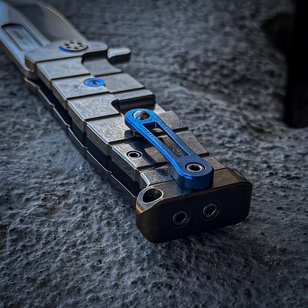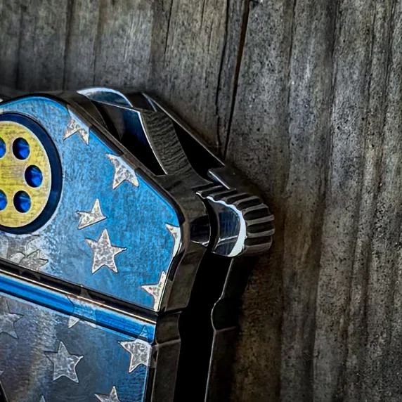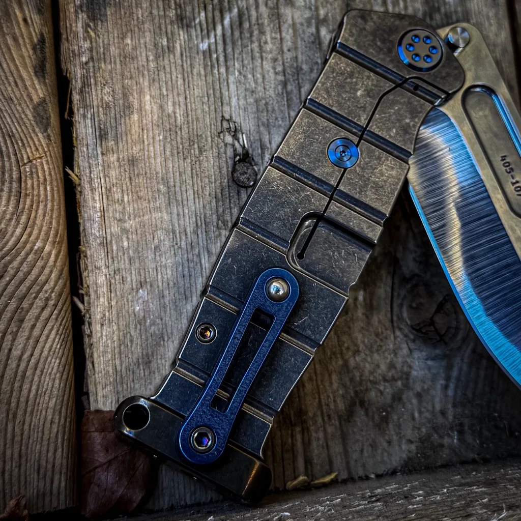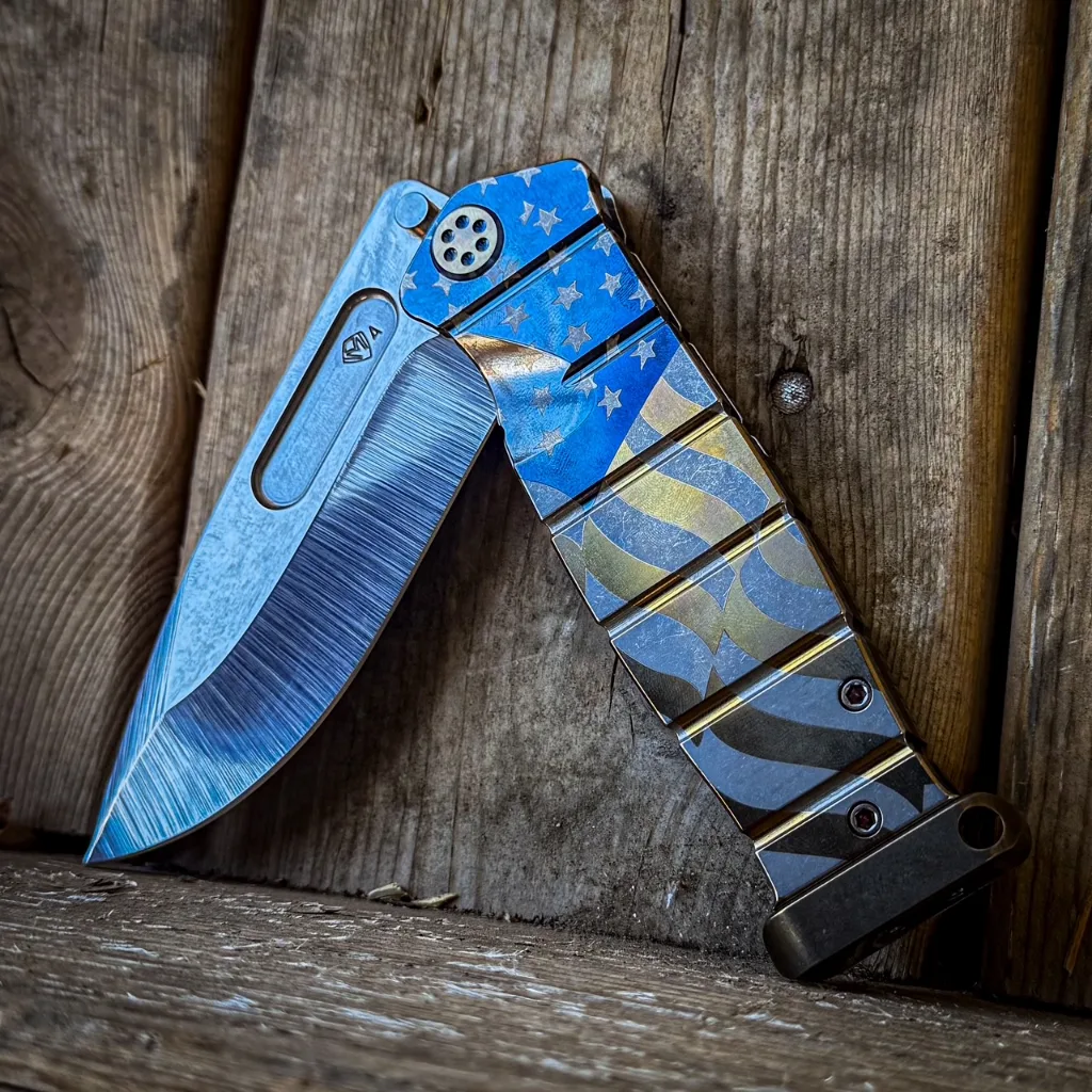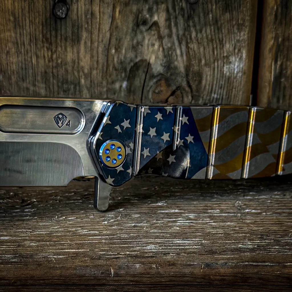 CPM S35/45VN TUMBLED BLADE AMERICAN FLAG LASER TITANIUM HANDLES BLUE-BRONZE HARDWARE, BLUE BRUSHED-BRONZE CLIP BRONZE POMMEL