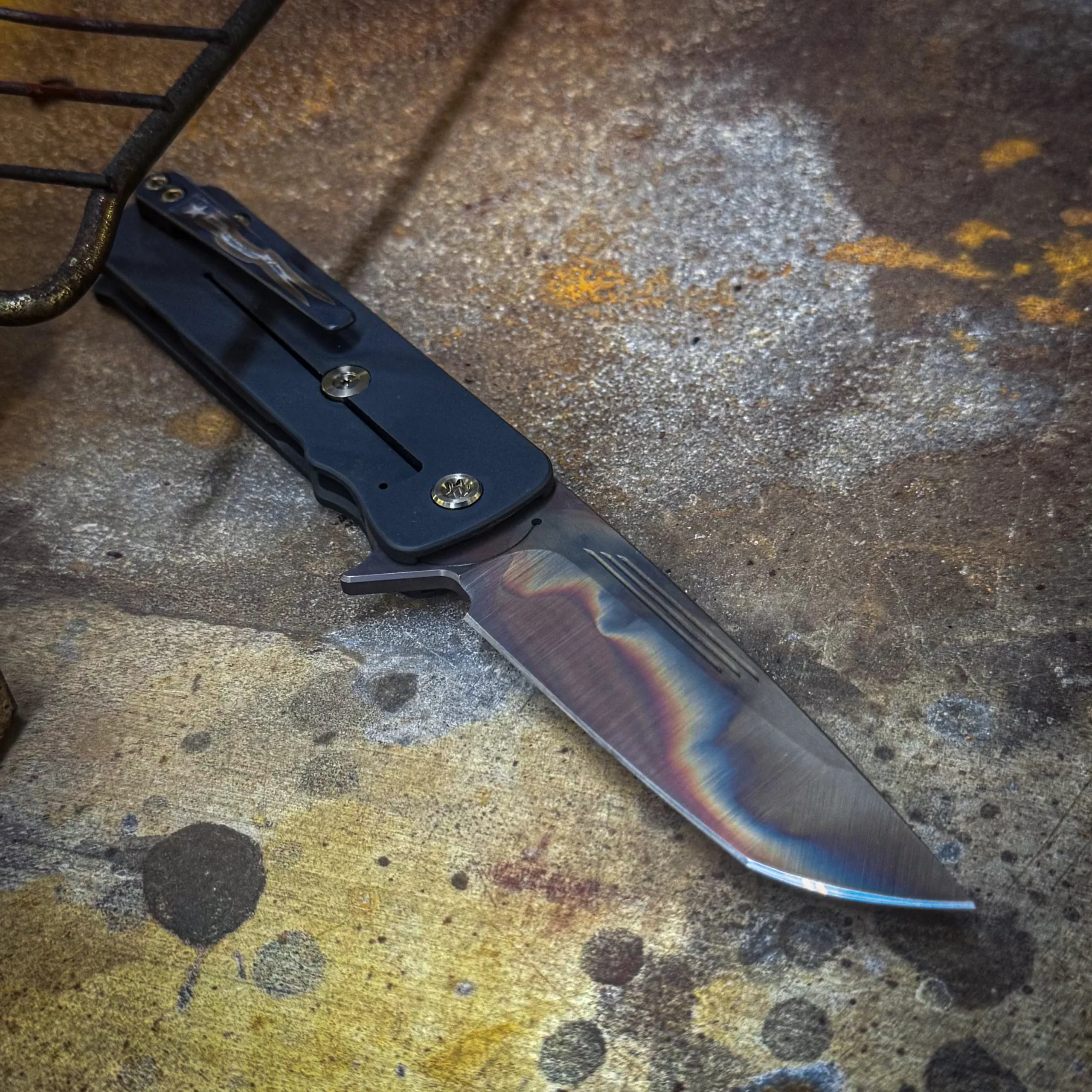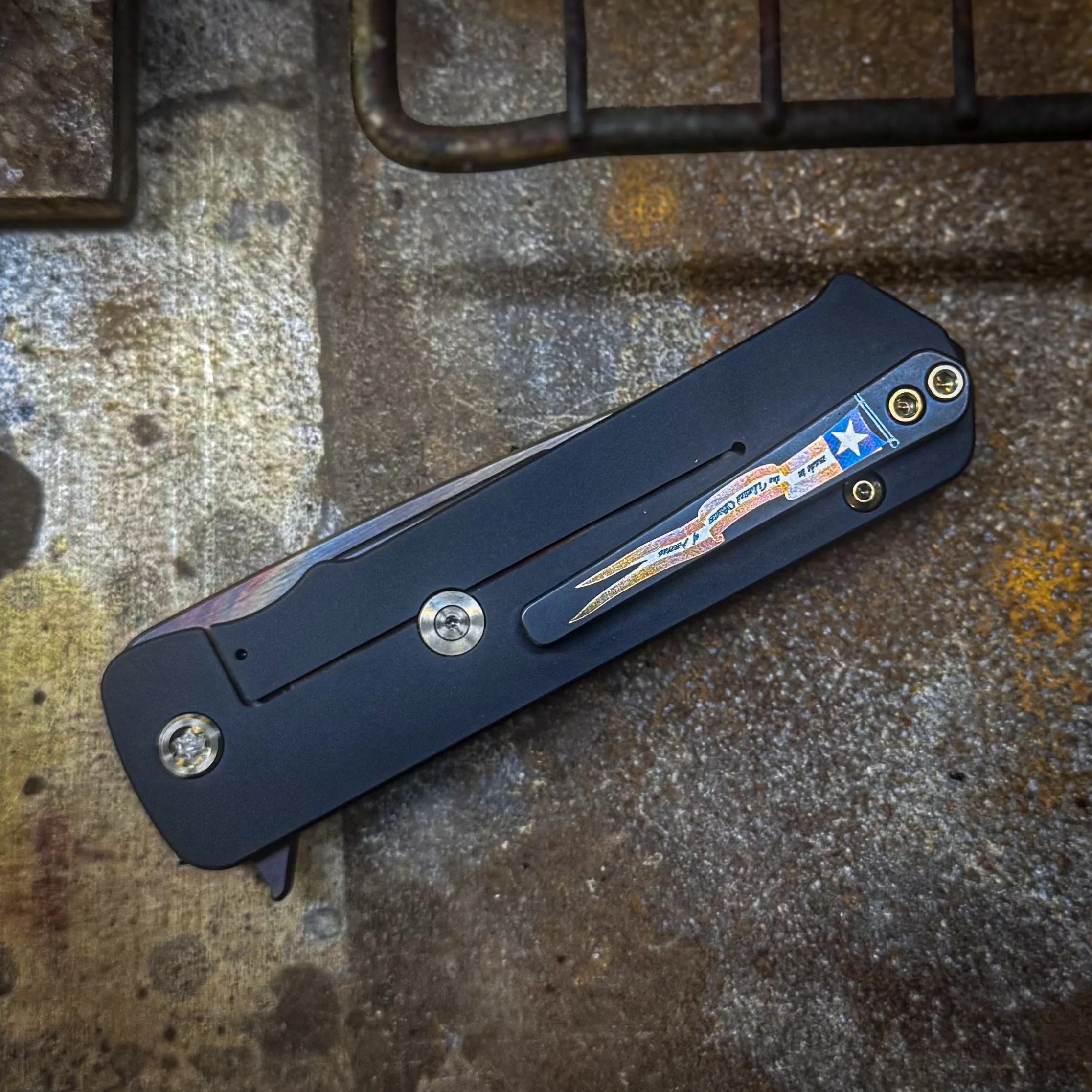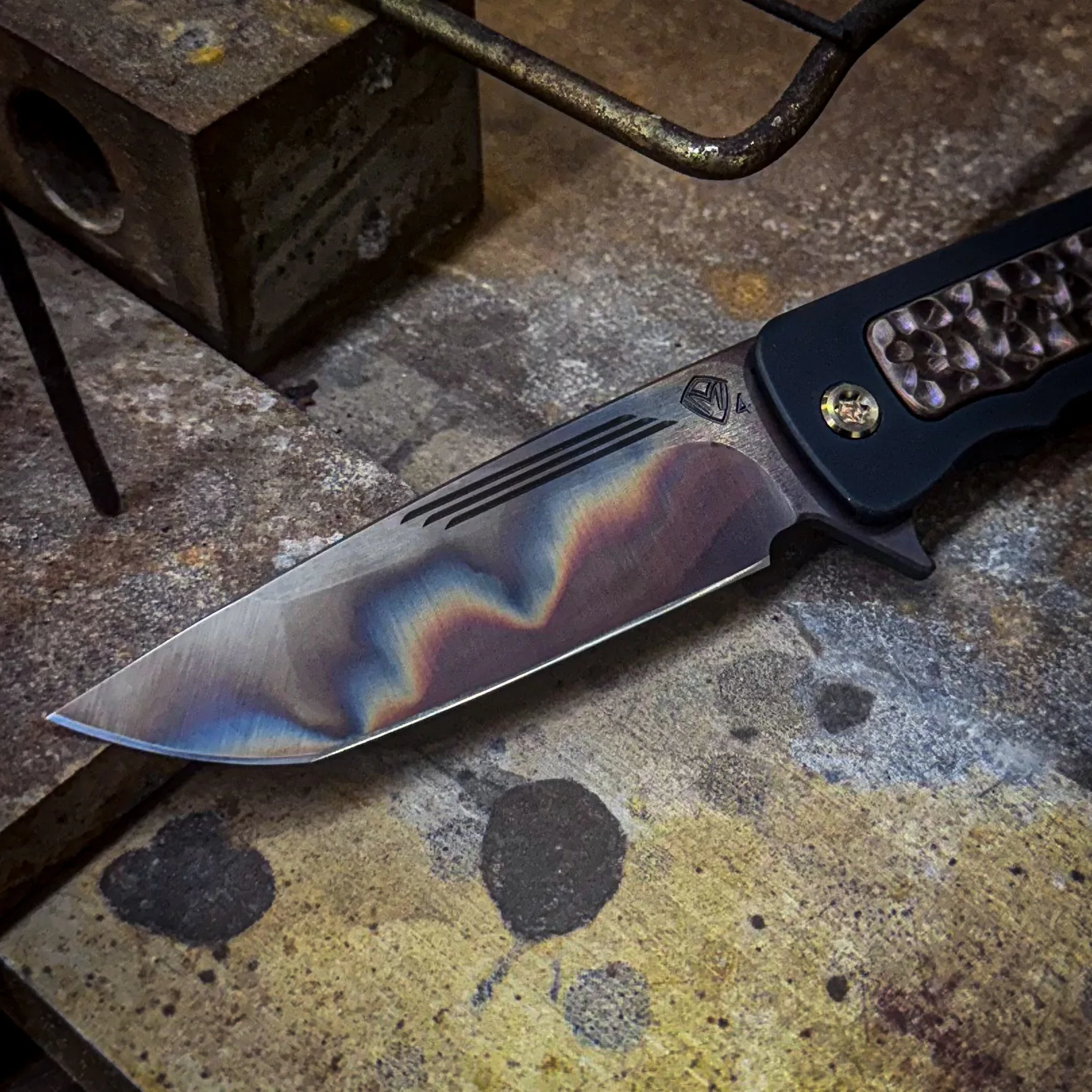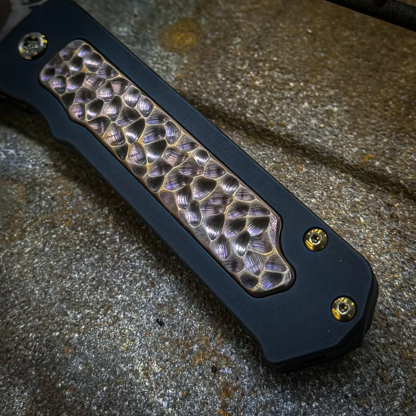 S45VN Vulcan Tanto Blade Black Handles with Violet Bronze Cobblestone Sculpted Inlay Bronze HW, DLC Clip/Breaker