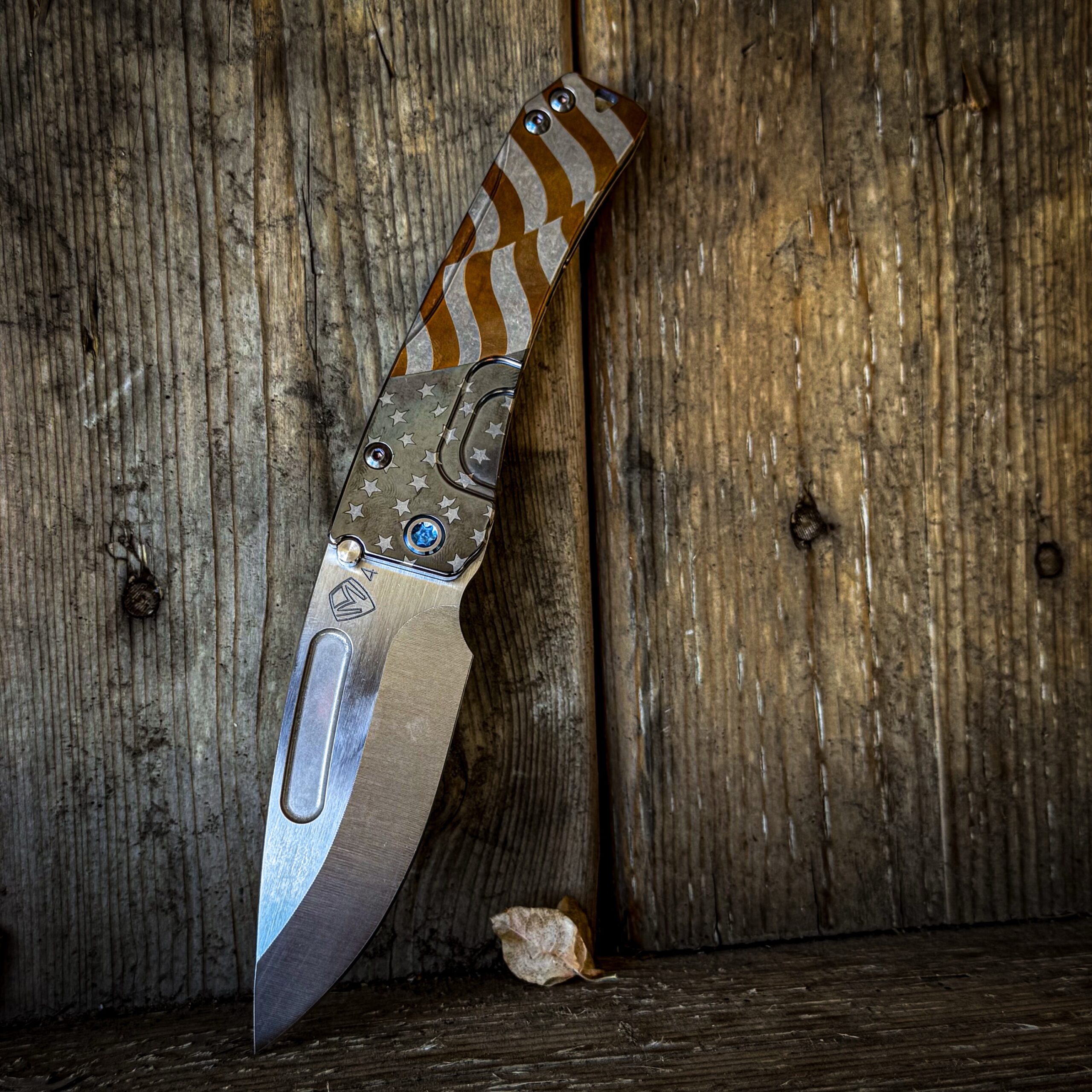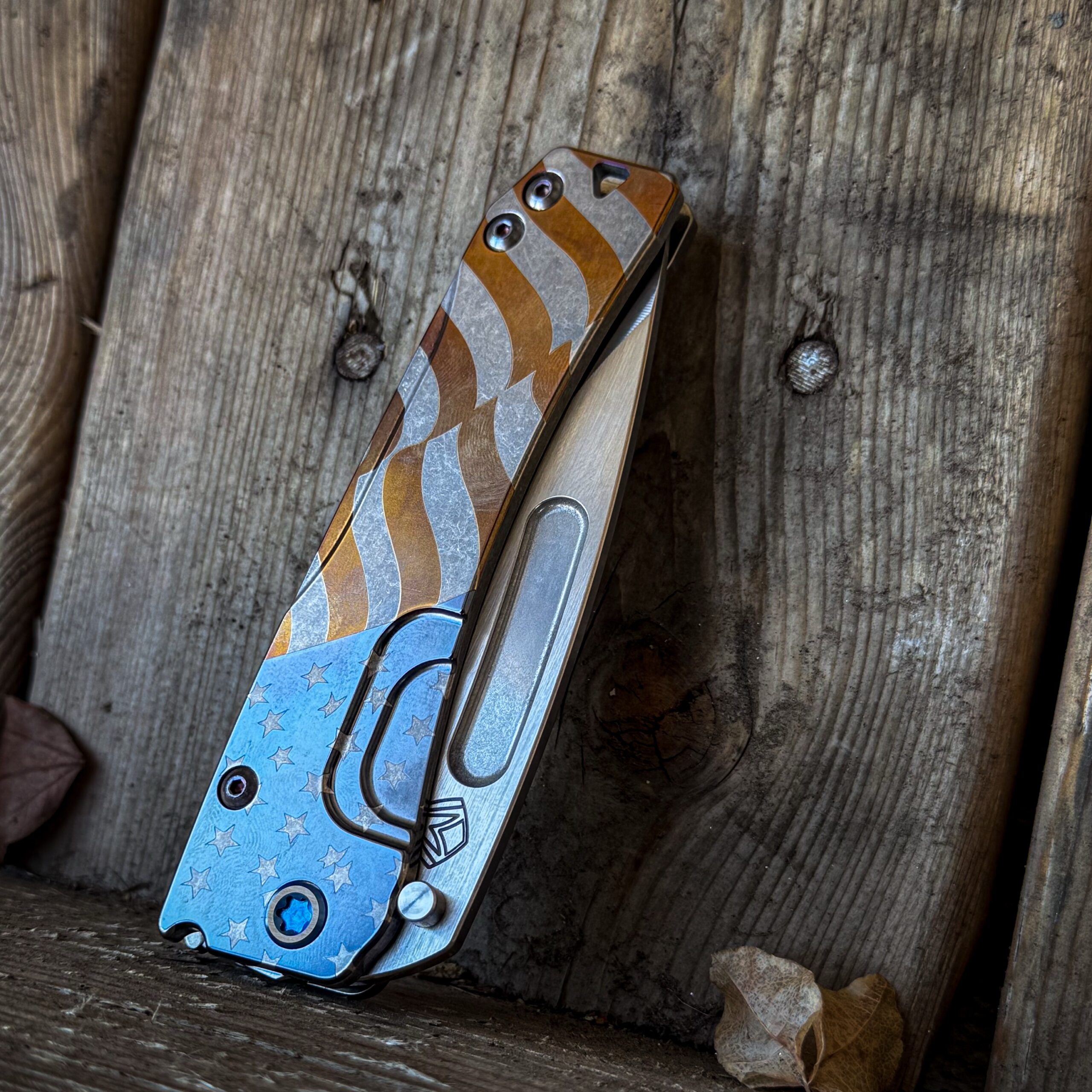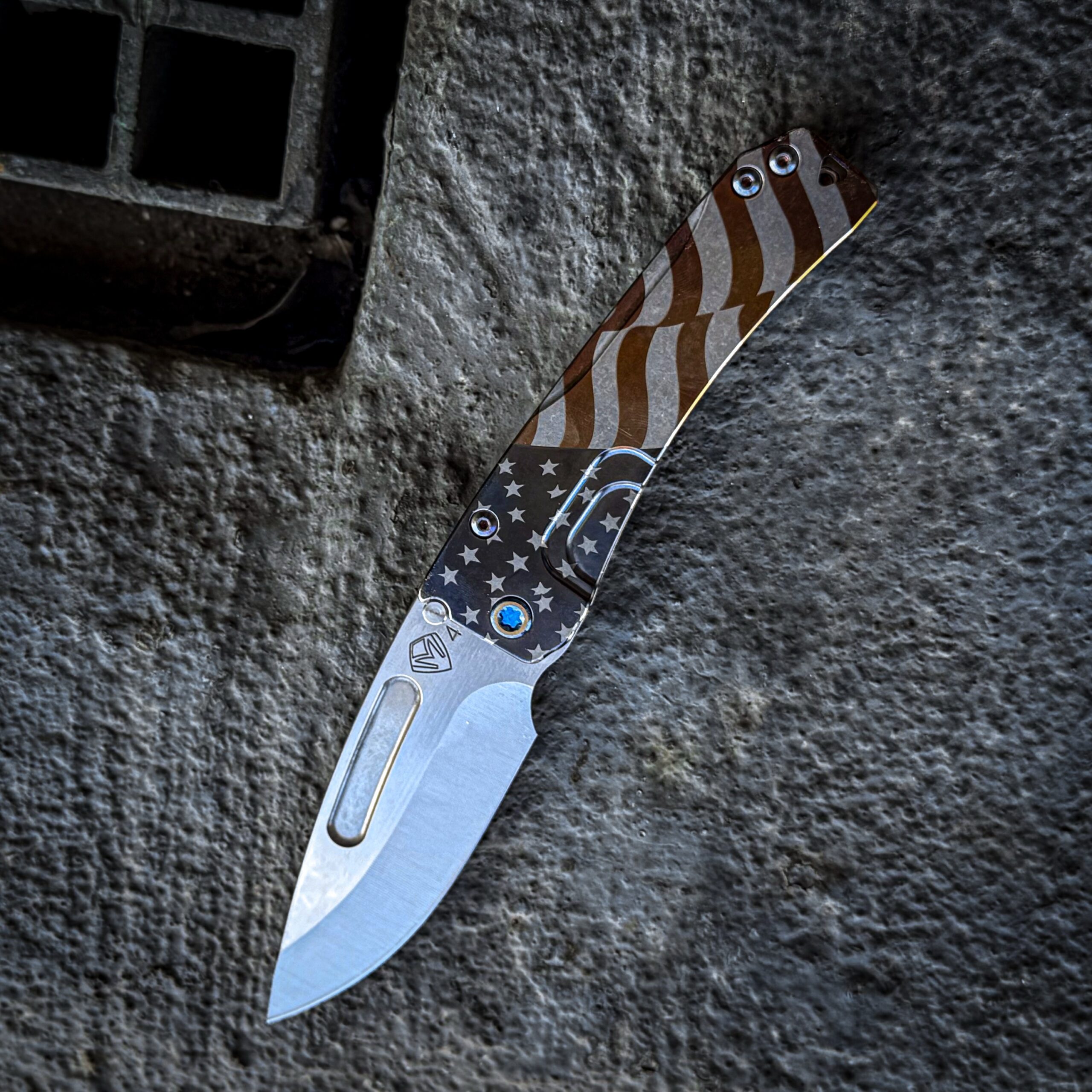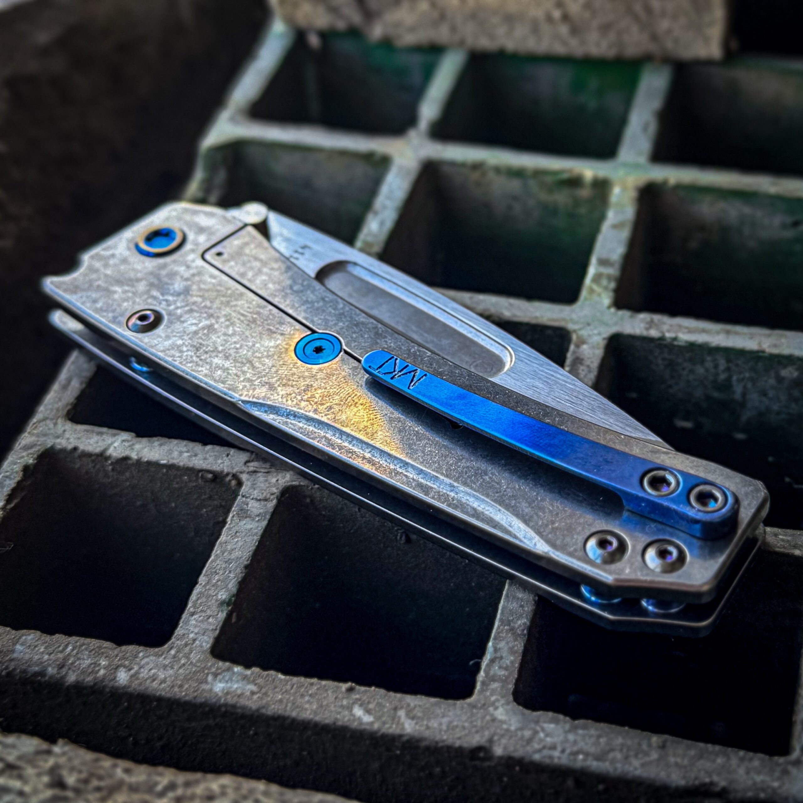 S45VN Tumbled Drop Point Blade Tumbled Titanium Flag Laser Handles Blue Faced Hardware Package Blue Titanium Clip