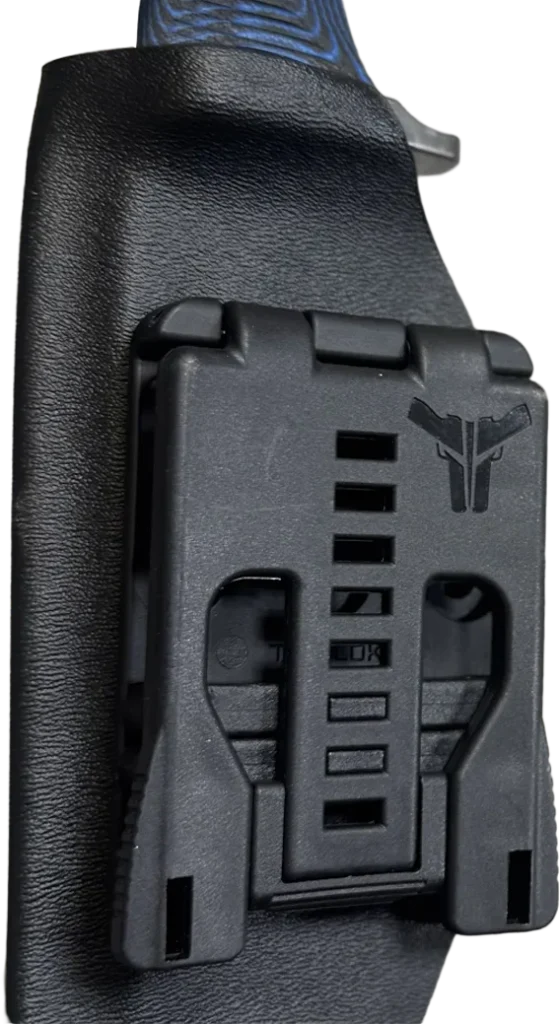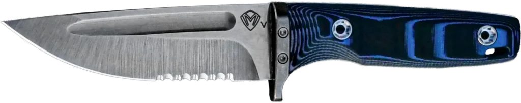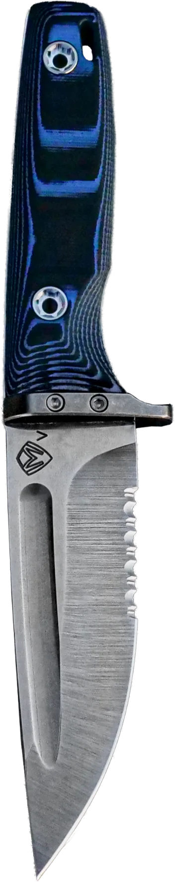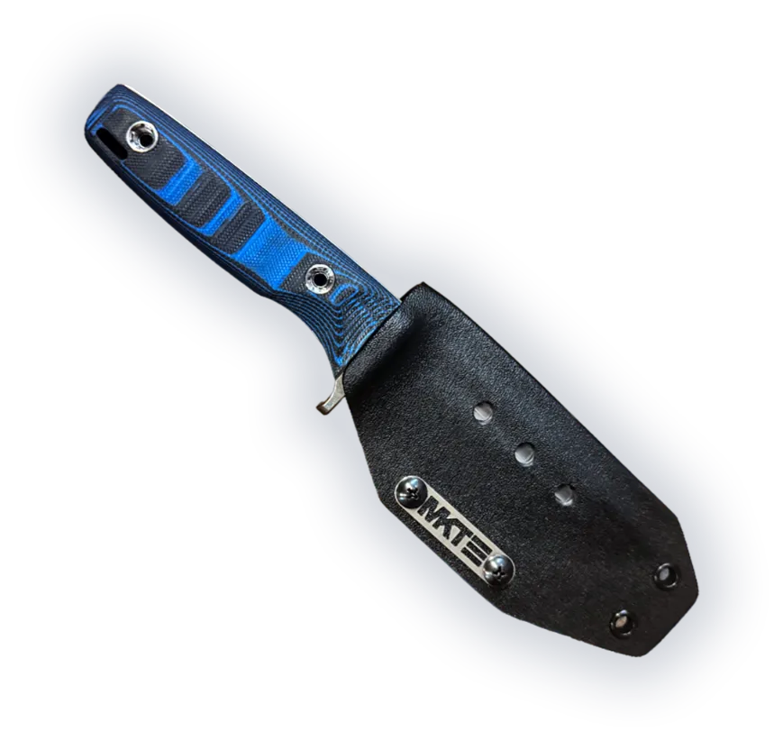 A small run of .260″ thick CPM 20CV Deep are being cut and finished at the MKT Shacktory featuring a new serrated drop point blade and we’re excited to show you some of the first ones in Blue & Black G10. A hand-ground, functional work of art – it’s fit for prying, poking, cutting and slicing in a deepwater environment, but we’re amazed how many people LOVE it for a daily fixed blade carry. The knife features a titanium hilt, hardware and high-retention black Kydex sheath.