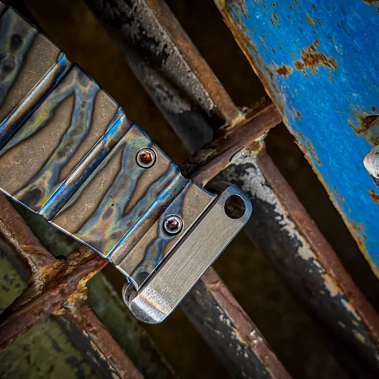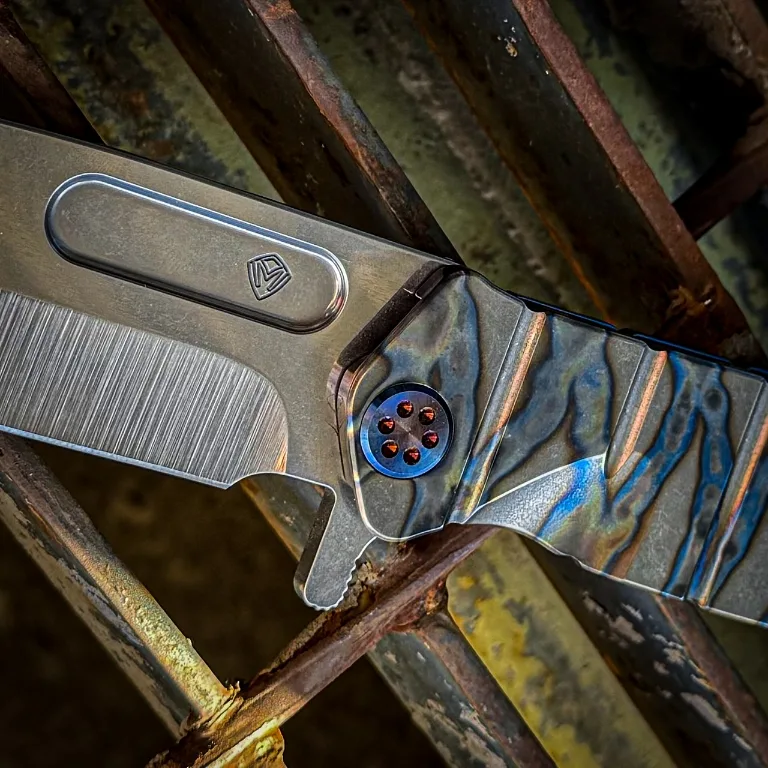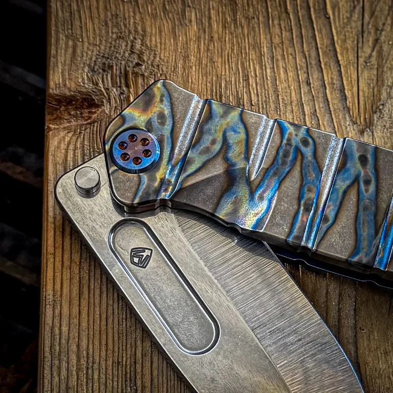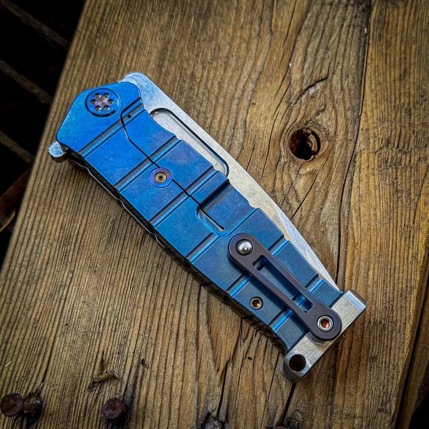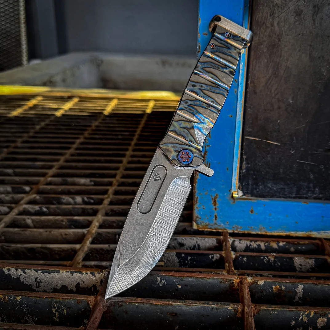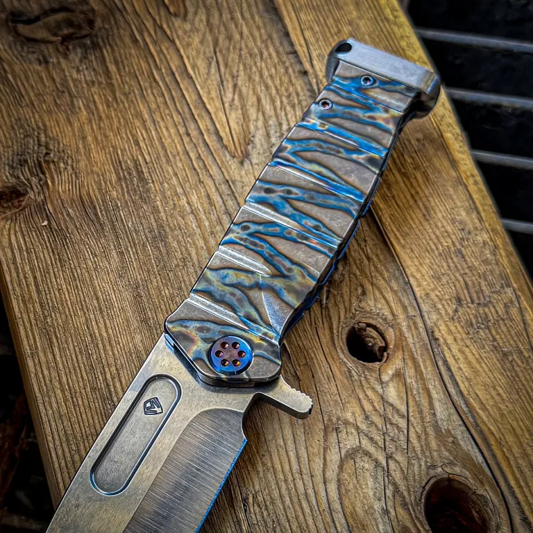 S35/45VN Tumbled Blade Tiger Stripe Flamed Handle Blue Titanium Back Side Flamed Hardware, Flamed Titanium Clip Brushed Titanium Pommel